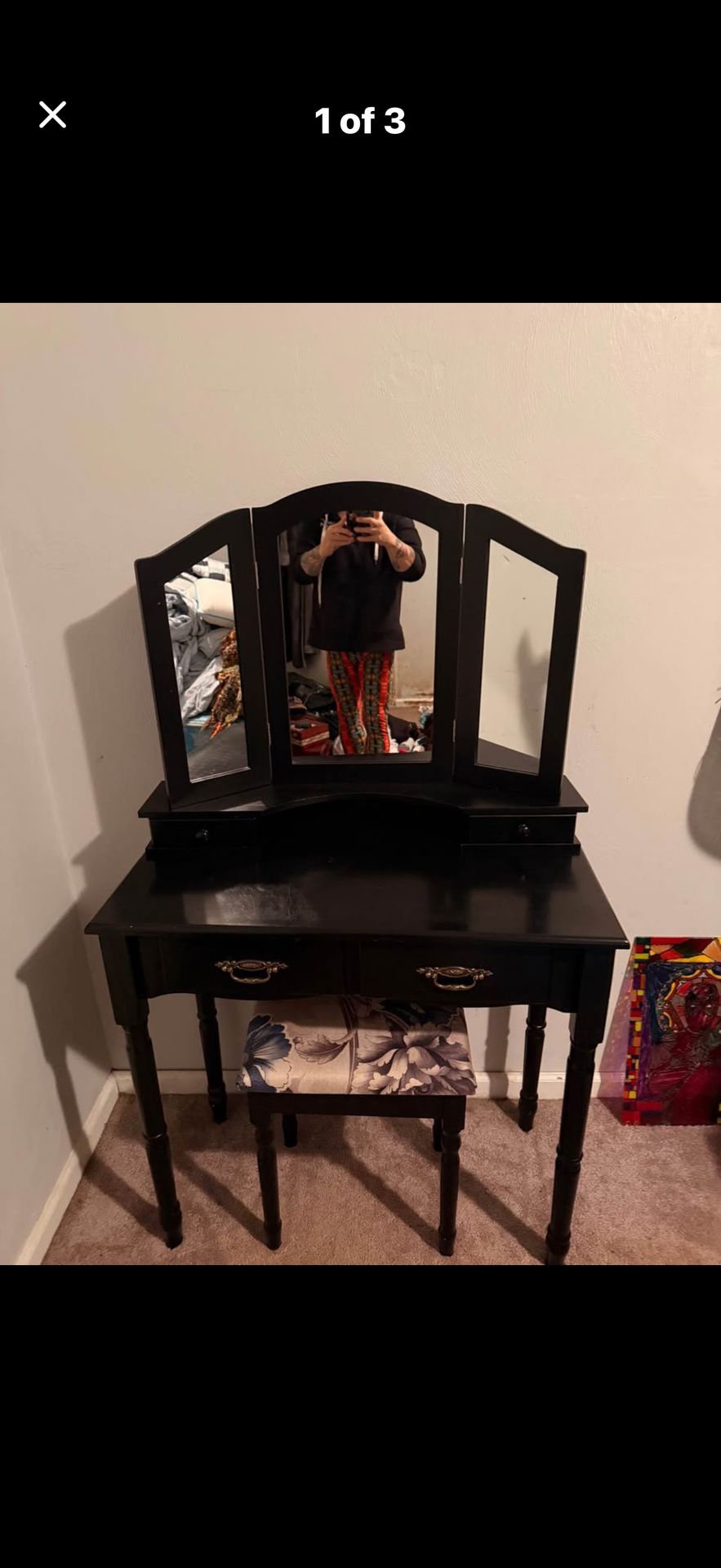 Dark solid wood make up vanity with mirror and custom upholstered stool