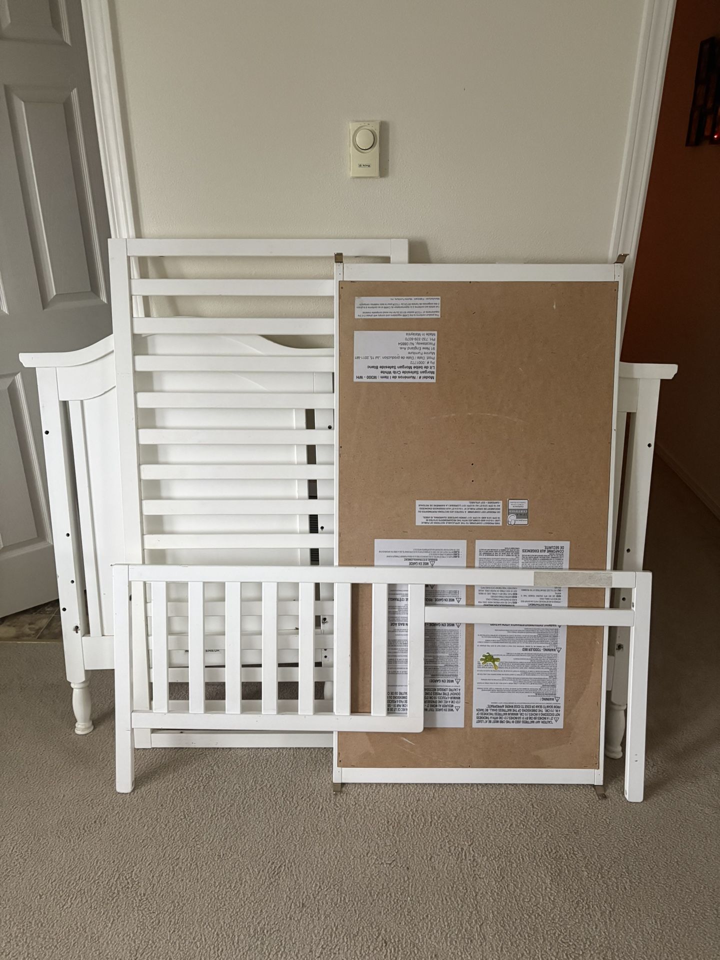 White toddler bed $30 obo Taken apart, you pick up. Comes with basic toddle mattress if you want it.