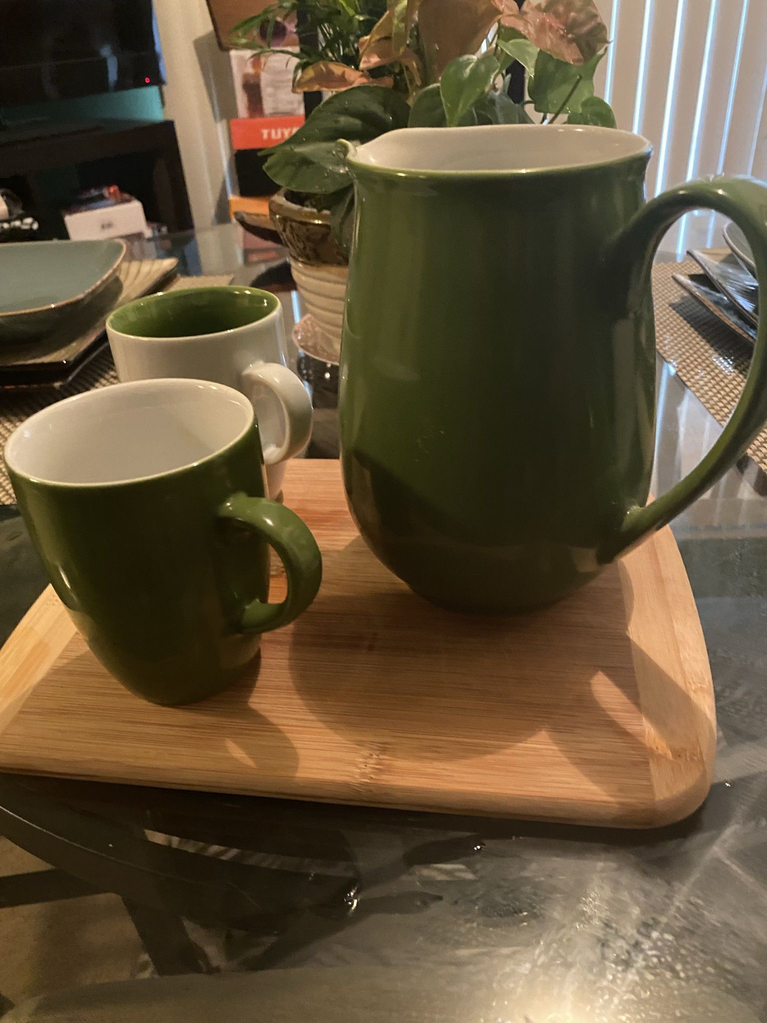Green and White pitcher W/2 cups Ceramic