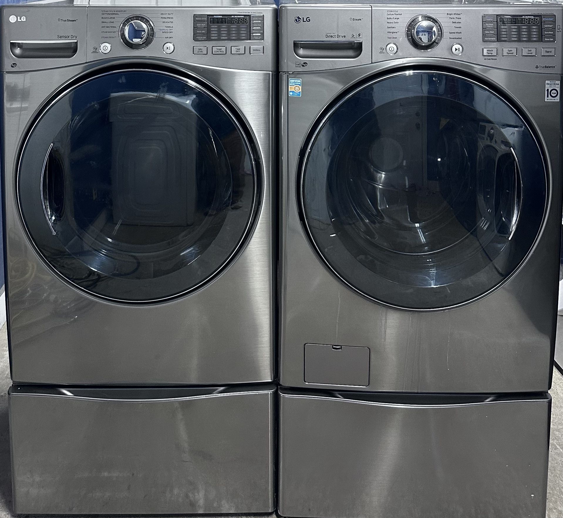 LG front-loading washer and dryer with pedestal. Everything works perfectly. Delivery available for an extra fee. $$