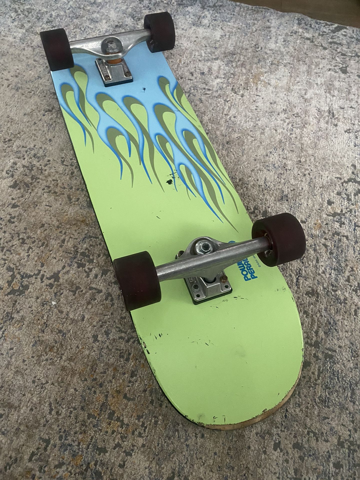 Powell/Peralta 90’s reissue board! Very good Condition Indy 171 trucks Hubbed bones wheels 63mm 80dur Bones red’s bearings Risers, clear grip tape! All custom Board is 33” x 9” A very Unique Board for the Vintage rider or larger Individual Risers