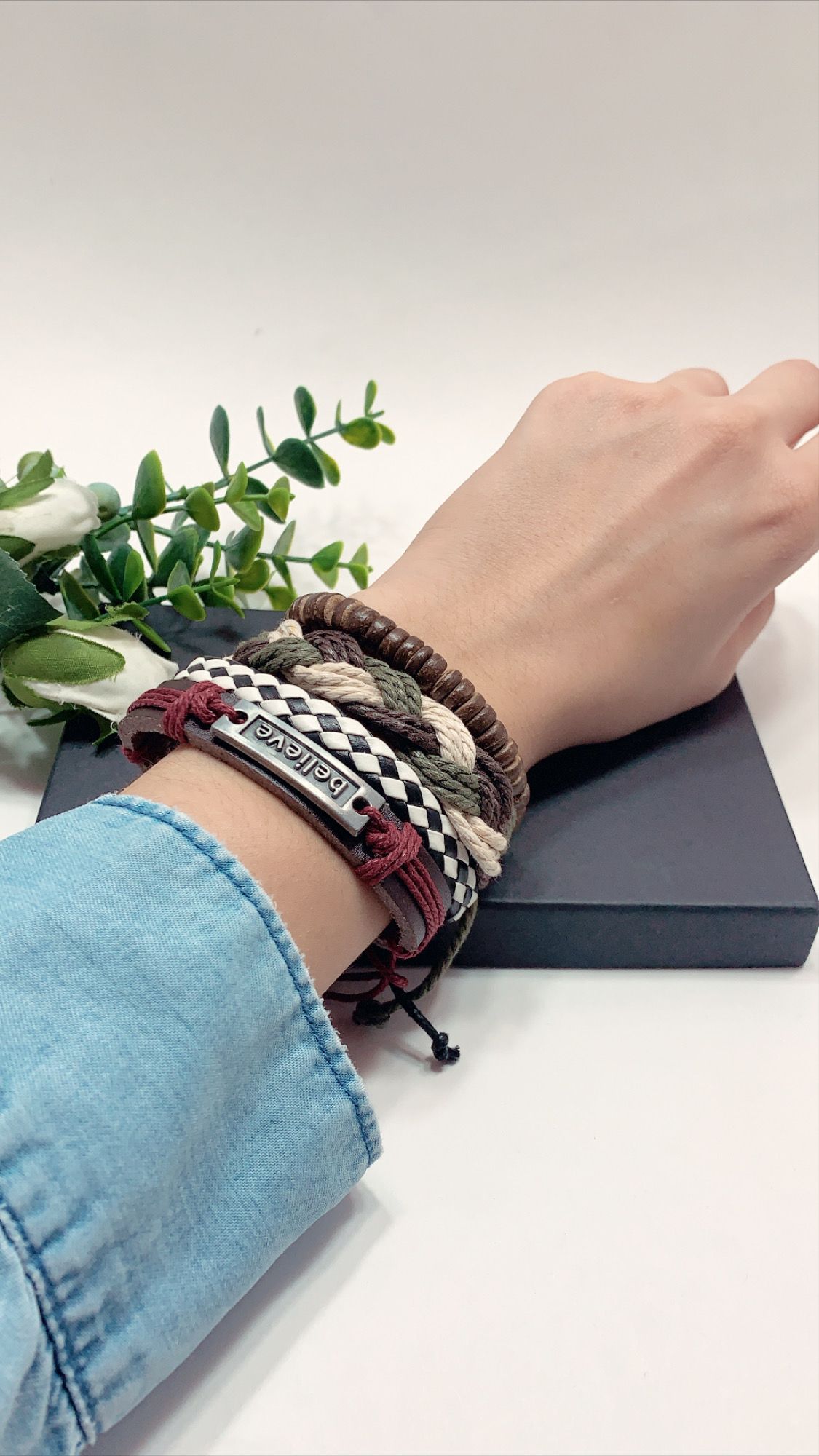 Adjustable Size up to 9.5inc Braided Multi-layer Leather Bracelet (Set of 4), Believe