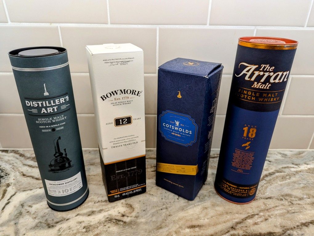 Beautiful boxes and tubes of high end whisky (empty) for your man cave, home bar, rec room, etc.