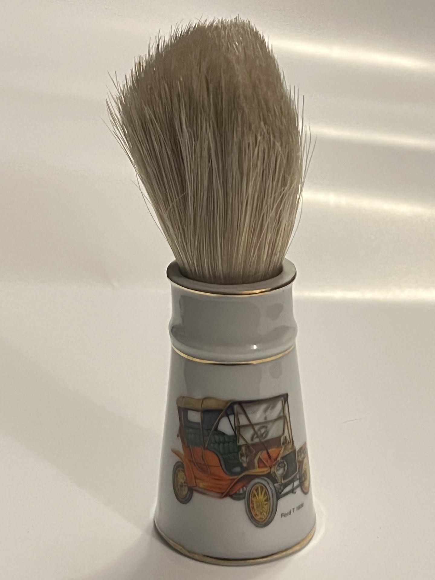 Royal London Gentlemen's Gifts Shaving Brush Porcelain handle with gold rim Wet-shave shaving brush, Mid Century "Gentlemen's Gifts" by Royal London Made in Taiwan Ford T 1908 car on front Price negotiable within reason.