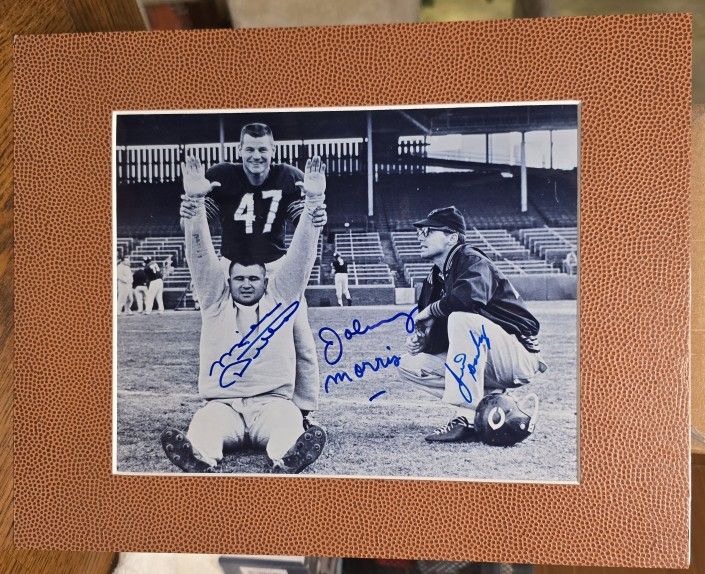 Ditka, Morris, Dooley Signed Photo! - Signed 8x10 "Black & White" Photo - Mounted To 11x14 Football Textured Mat - Signed By: TE Mike Ditka, HB Johnny Morris & WR Coach Jim Dooley - All 3 Are Members Of The1963 NFL World Champion Chicago Bears $40 Take $10 OFF...if you purchase by 12/23/25 (An OUTSTANDING Deal!) Makes A Great Holiday Gift!