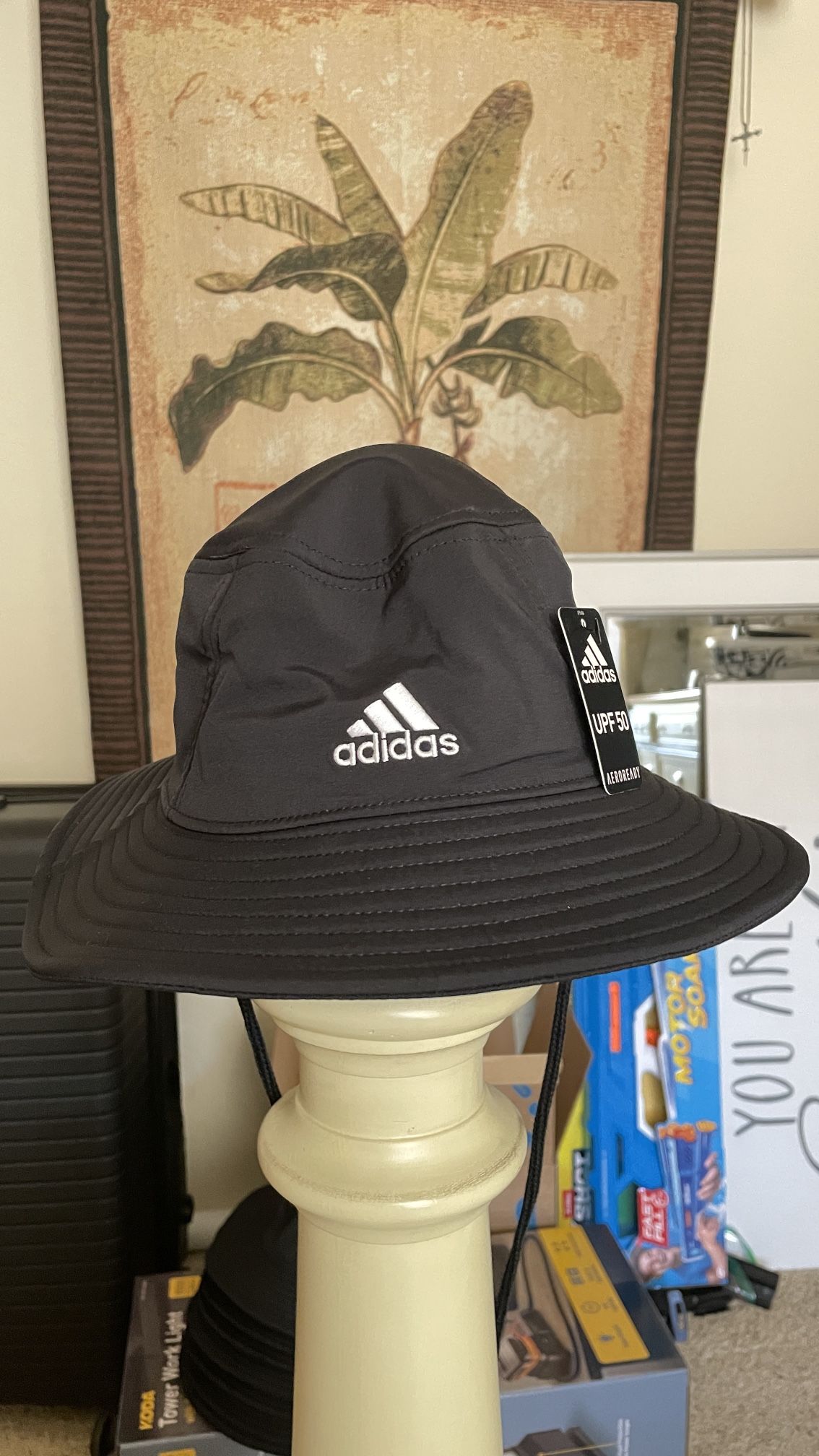 Black Adidas bucket hat. New. Light weight moisture wicking sweatband. Only one available. About this item • UPF 50 sun protection • Adjustable drawstring • Circumference: 23 in | Brim length: 2.75 inches. Pickup in City of Surprise only near Litchfield and Peoria.