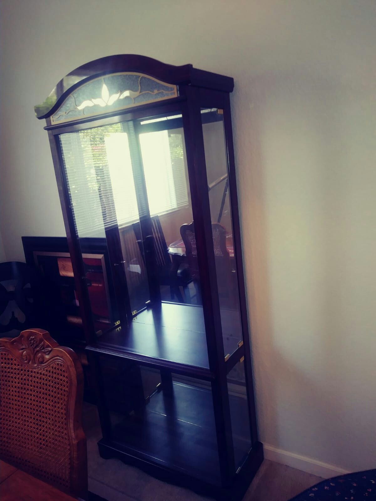 Beautiful cabinet, nice wood work details, I stalled lights and side glass doors, ideal for display critals, dishes, dolls etc. In excellent condition.