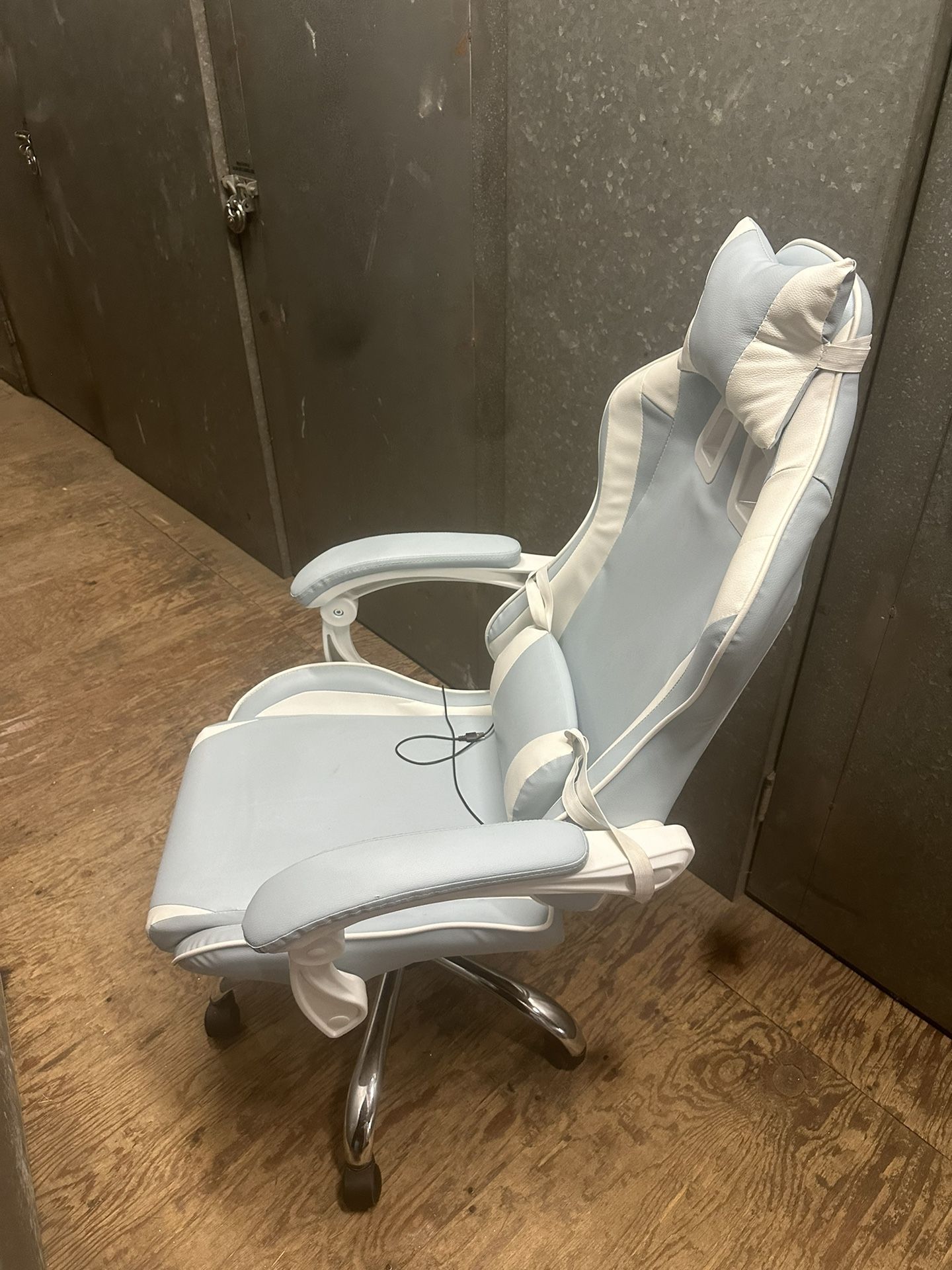 Nice baby blue gaming chair. Used but looks brand new. Wired vibrated massage. Overall great chair