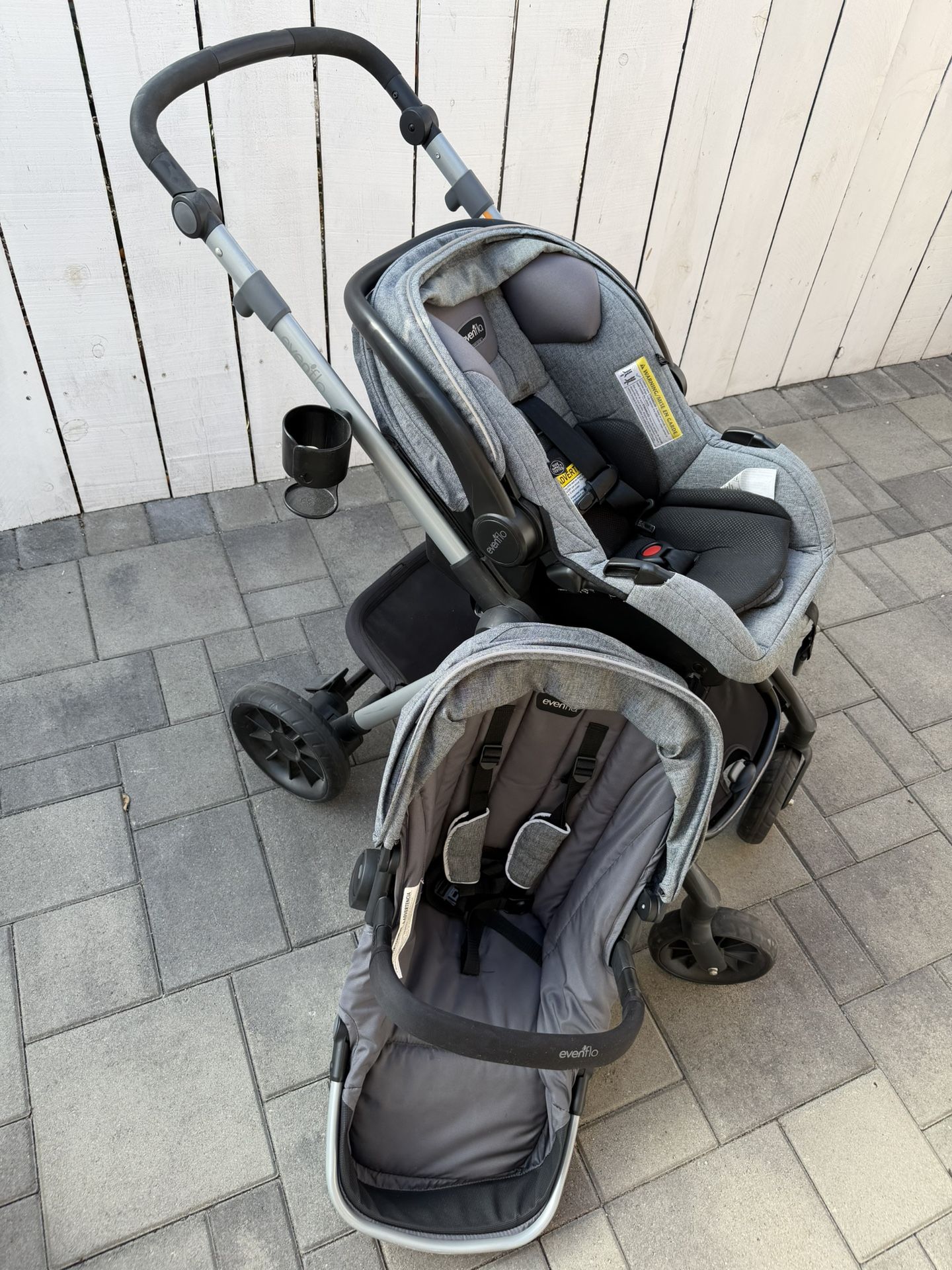 Excellent condition. Barely used only a few months old. Evenflo travel system comes with Stroller, Infant car seat with base, infant inserts, and toddler seat when child gets older (all included). Lightweight and can be folded easily. Price firm local pickup 92126 cash only
