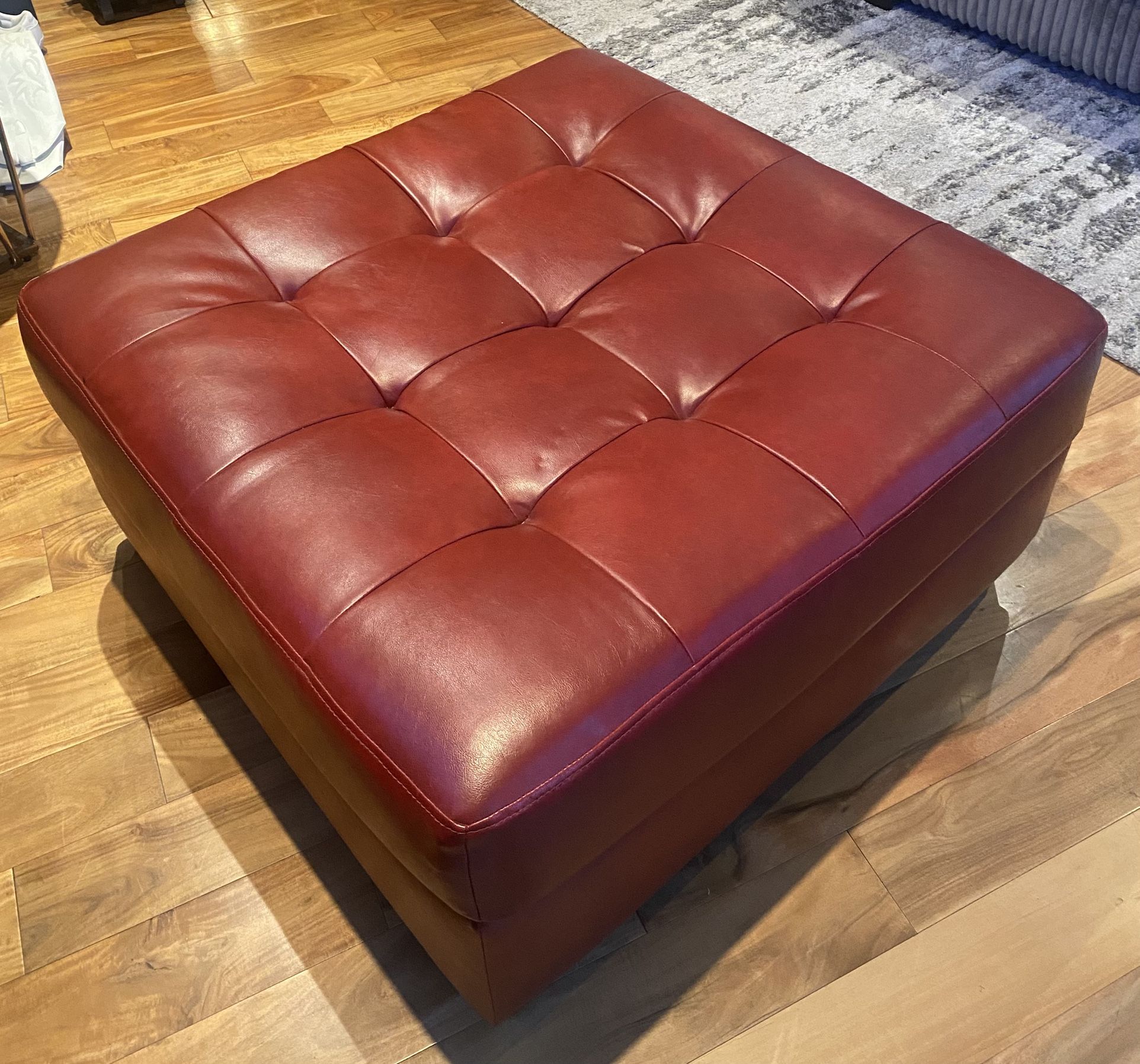 Gently used gorgeous red faux leather ottoman. Perfect addition to a living room space! Approximately 40 inches x 40 inches in size. Original price: $200 YOUR PRICE: $40