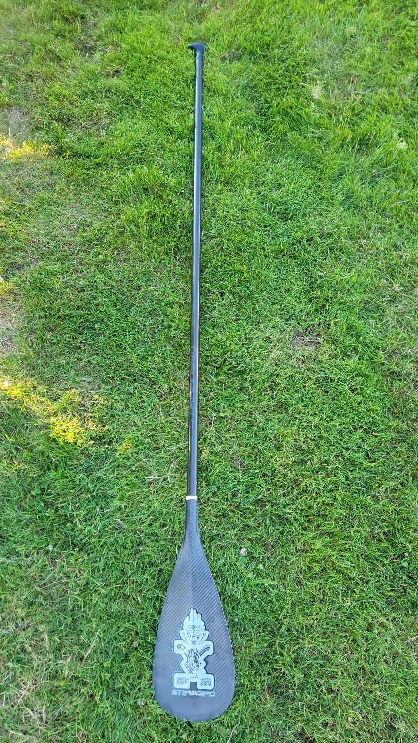Paddle is at it's original uncut height (around 7½ ft) so no matter your height, you can cut it down to your preferable choice. Paddle sits at a very nice 1.4lbs. super light. It's got a bit of cosmetic wear (lettering worn off and slight yellowish coloring at bottom) And slight wear on edge of blade tip Upgraded my paddle, so im not in need of this one any longer