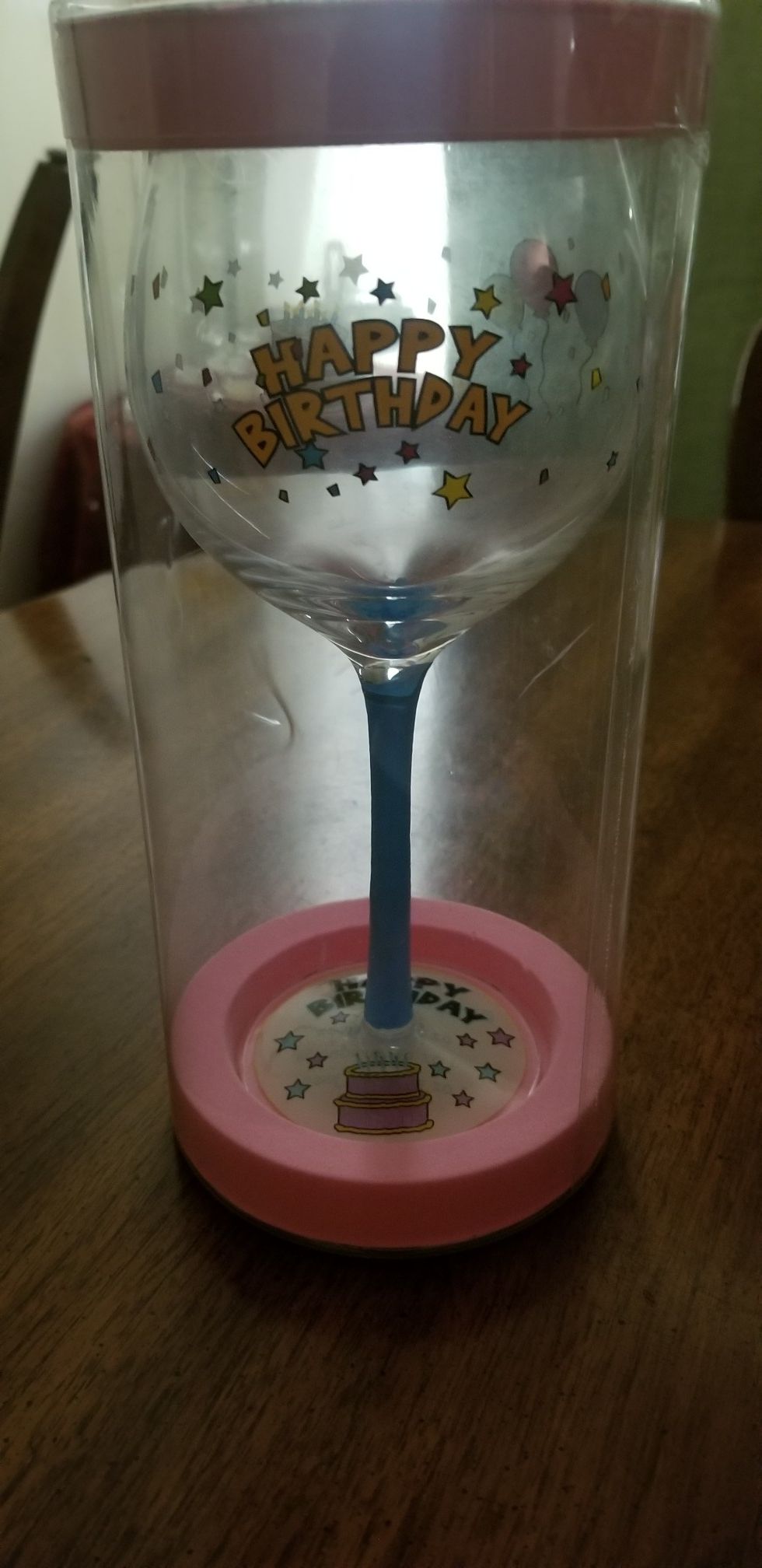Wine glass is decorated with Happy Birthday, a birthday cake and candles, balloons, and confetti. The stem is blue and the base is detailed with a Happy Birthday, bday cake with candles, and stars! Still in it's original container and packaging. I thought it was too cute to use, but now its time for this wine glass to get some use with somebody. Fun for a gift!