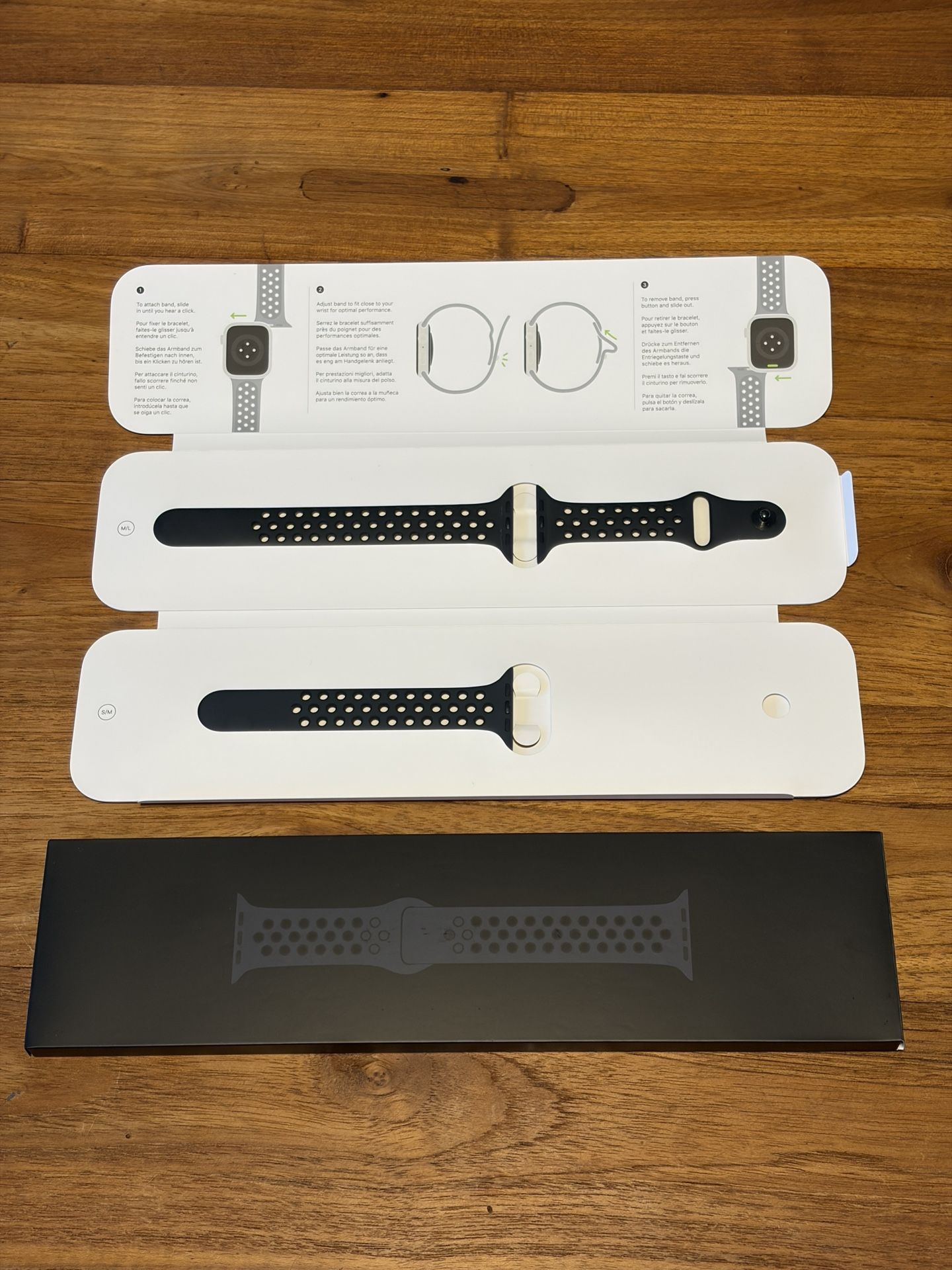 Brand new, never used, in original box. Apple Watch Nike Sport Band 45mm Anthracite Black. Comes with both band sizes, S/M & M/L.