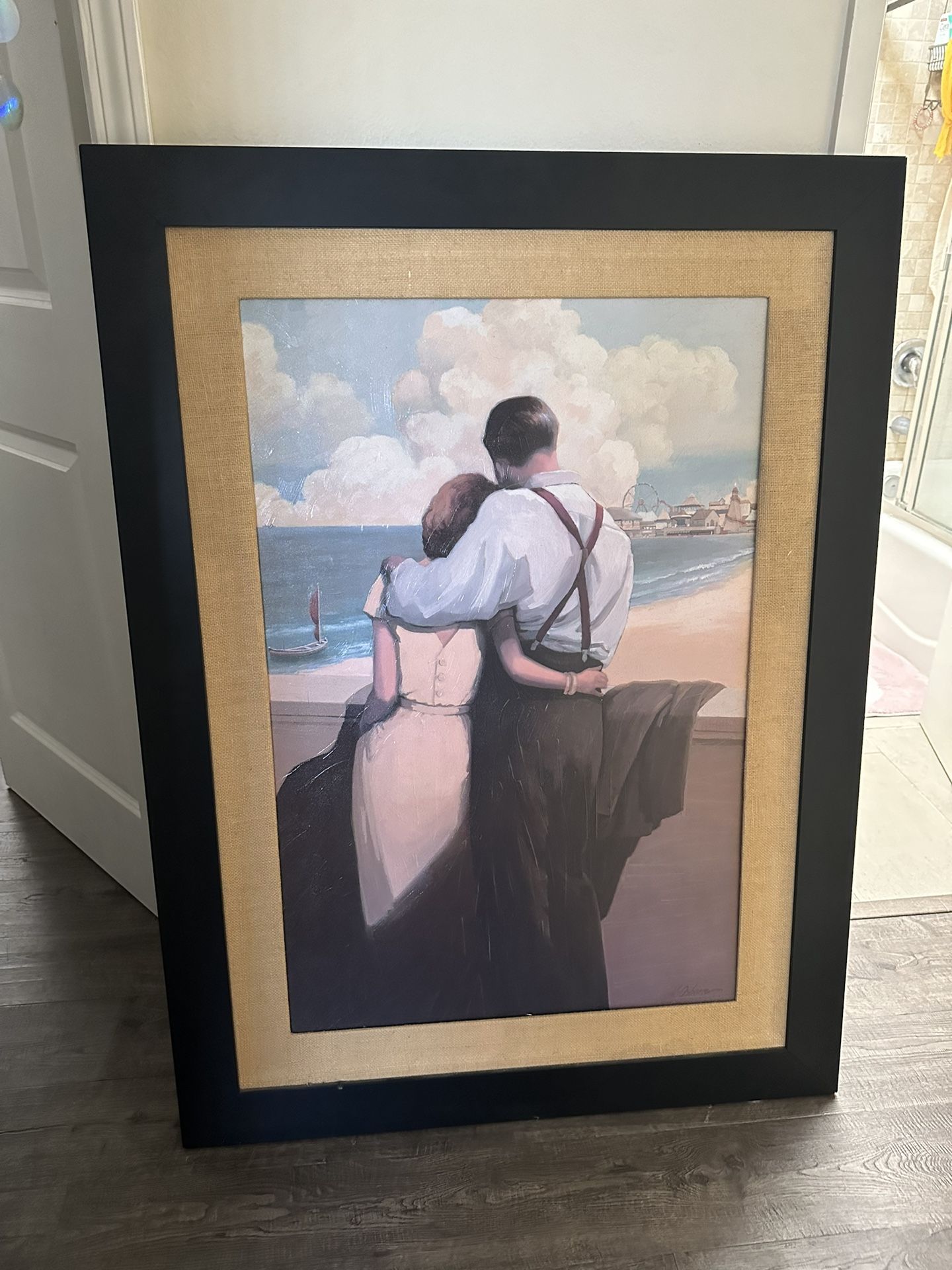 FRAMED “Lovers Point” by Jacqueline Osborn. Measures roughly 54 inches tall by 33 inches wide. Romantic painting of a couple looking out over the beach, with a pier in the background. I’d like to think it is Santa Monica Pier in CA. Obvious vintage/retro style to the couple which adds romantic charm to any space. If you were to buy Lovers Point (un-framed) it lists between $150-$210 online. THIS painting comes already in an exquisite frame. The frame consists of a nice dark/black wood with a chic cloth/burlap matting. Though I bought this as-is, I’d imagine whoever paid to frame it certainly added value onto the piece by doing so. Price is certainly negotiable.