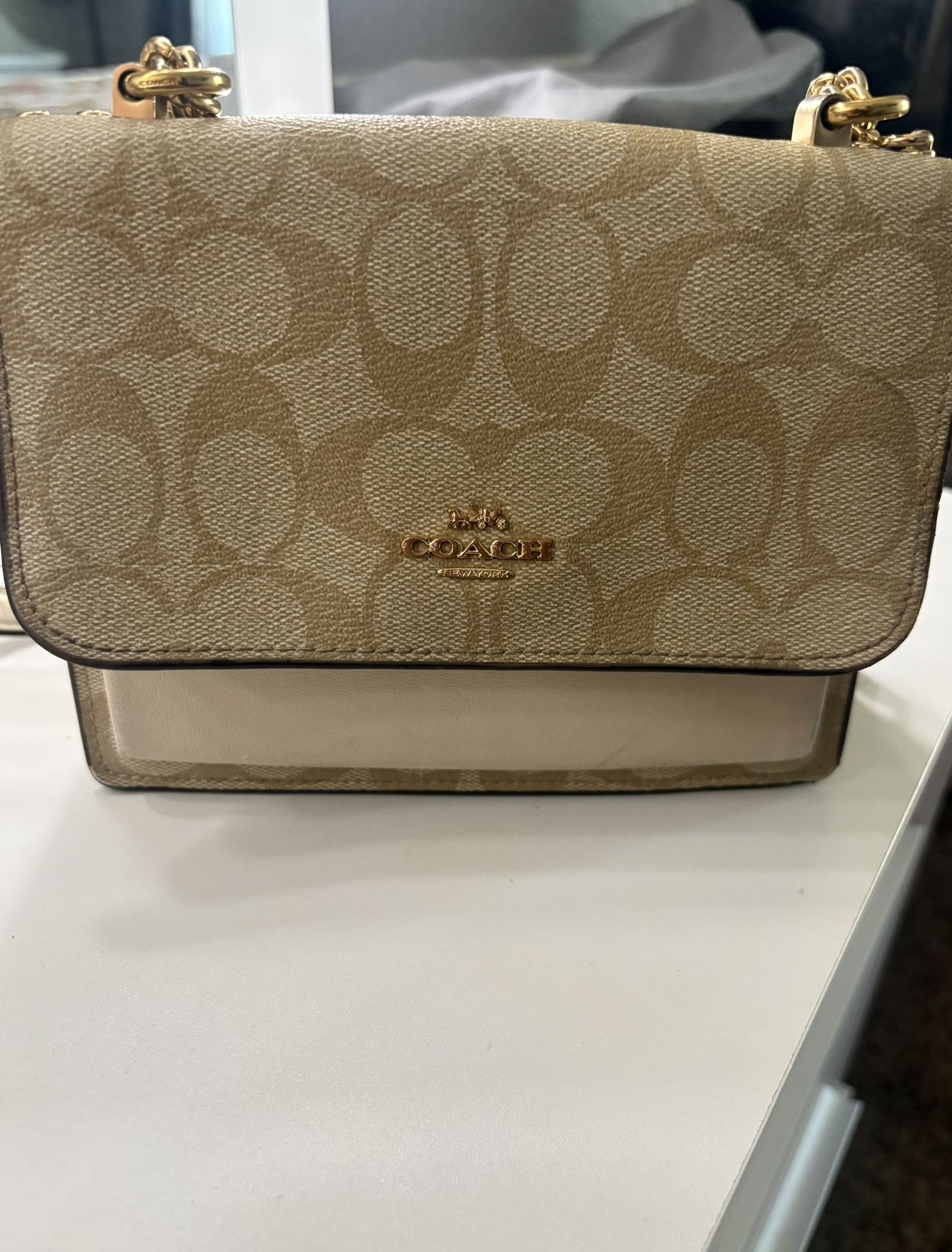 *Need it gone by Dec 19. Coach Klare Crossbody Bag Color : Light Khaki worn a couple of times Like New *Message for more pics light khaki, signature monogram, crossbody, coach bag, neutral tones, fabric texture, minimalist, everyday, compact, casual style
