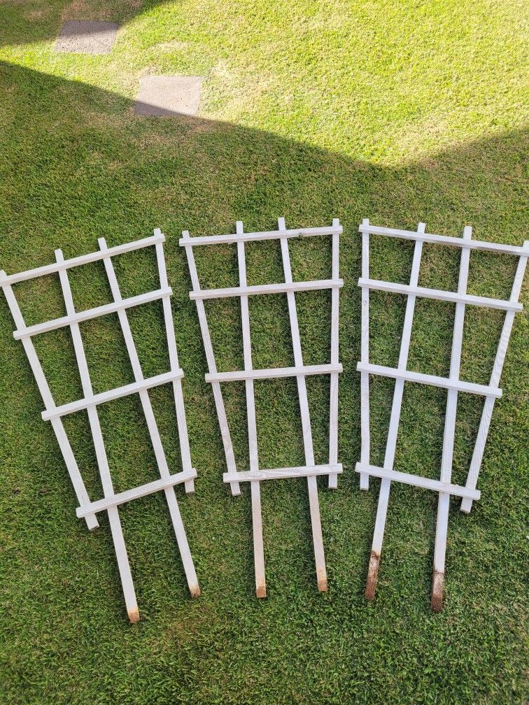 Only Qty. 2 left Natural wood Cedar Garden Trellis For Climbing Plants 54" by 24" $10 each ($25 each at Lowe's). We spray painted them white to match our fence, but we no longer need them. Keywords: plant, plants, garden, trellis, Monsteria, roses, tomatoes, cucumbers,