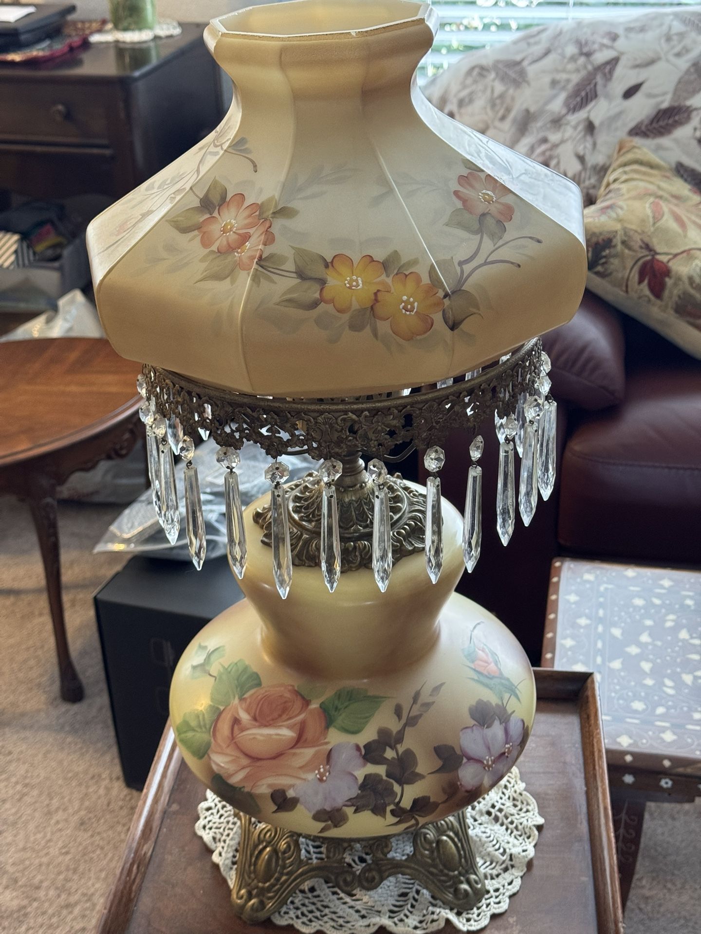 Beautiful Antique Hand-painted Parlor Lamp . Lots of hanging crystals and Brass trim and Base . New electrical cord . Has light in the bottom as well as the top . Works Great . Can have them all on or just the top or bottom if you choose . Cash Only .
