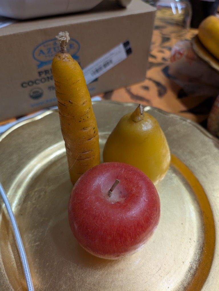 These realistic fruit are actually candles. There is one carrot, one apple and one pear. They are $5 each. They would make terrific gifts! They are located in downtown Winter Garden or can be shipped