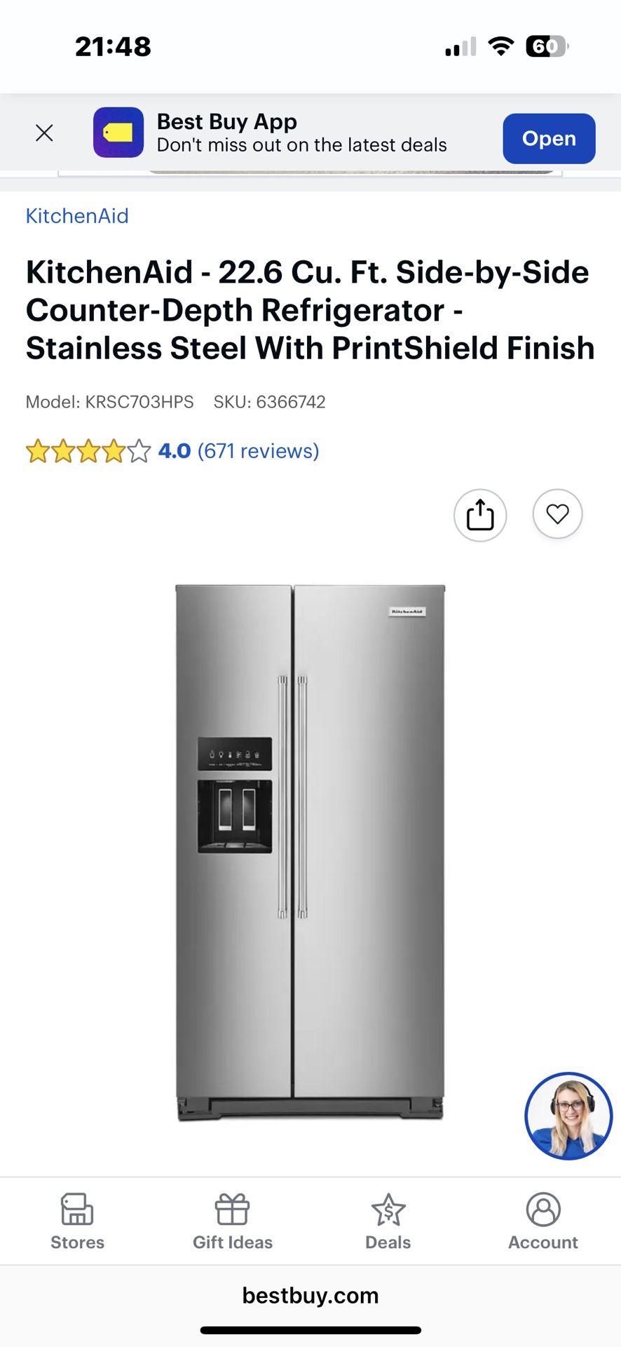 KitchenAid 22.6 Cu. Ft. Side-by-Side Counter-Depth Refrigerator – Stainless Steel (Brand New) Model #KRSC703HPS05 💲 $1,000 📍 Palm Beach Gardens (Avenir)– Pickup Only Brand new fridge from a new home – works perfectly, just switching to a different brand to better fit our space. ✨ Features & Highlights: • Counter-depth design – sleek, built-in look that fits nearly flush with cabinetry • PrintShield stainless finish – resists fingerprints & smudges, easy to clean • Preserva® food care system – dual cooling keeps fresh and frozen foods at ideal temps • In-Door-Ice® system – maximizes shelf space • LED lighting – bright, energy efficient, easy-to-see interior • Measured water fill – automatically dispenses water in ounces, cups, or liters • Exterior ice & water dispenser – convenient and modern • Clear door bins with metallic accents – stylish and functional 🧾 Includes: Refrigerator, water filter, and owner’s manual 💡. Must pick up.