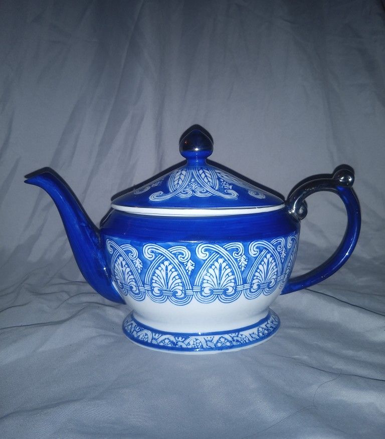 Bombay style tea pot by Bloom Rite. Cobalt blue, white with silver accents. Decorative purpose only. Measures approximately 9" x 6" x 6"