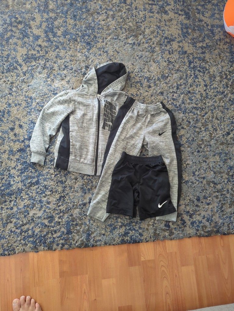 Gently used boys sweat suit and shorts size medium/ 6 grey black