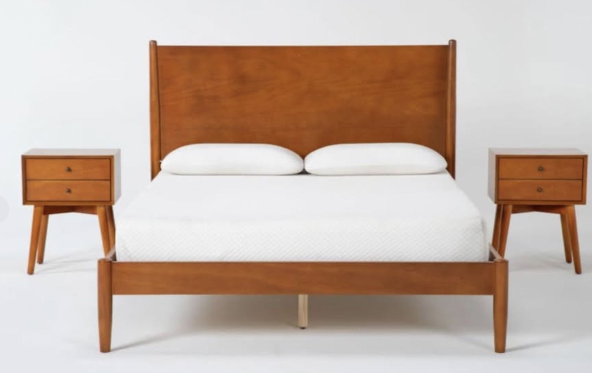 We had it in the kids room for our vacation home just never used it! Wood Bed Frame and Headboard. Wood Night Stand Table Set of 2 (USB plug and 2 drawer). Color for all items is a beautiful Cherry Brown. Full Size. Price is what I paid without shipping. Mid-century modern has solid rubberwood okoume veneers, a warm cherry hue to your resting space. Set includes a full platform bed with matching headboard and two night tables, all designed with tapered legs for an elegant look. Comes with: Rails, Headboard, Footboard for the Platform for Bed Includes full platform bed, headboard, and two night tables Made with solid rubberwood and okoume veneers in a cherry finish Mid-century modern design with tapered legs. There is a mattress but kids stained it with paint. If you want it you can give me your price for it given the stain on one side in the middle.