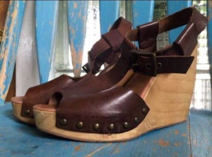 💛Perfect Dark brown Leather Bertie Brand wooden wedge Sandals, women's size 8 💛