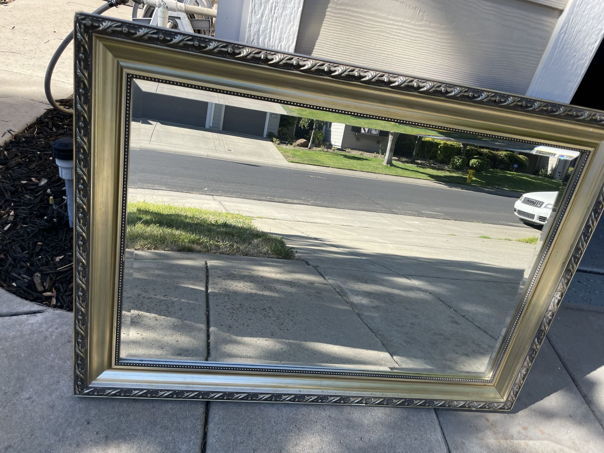 Beautiful, heavy vintage gold mirror with design. Minor scratches (look at pictures). Can easily be fixed or repurposed. Approx: 31” x 42.5”