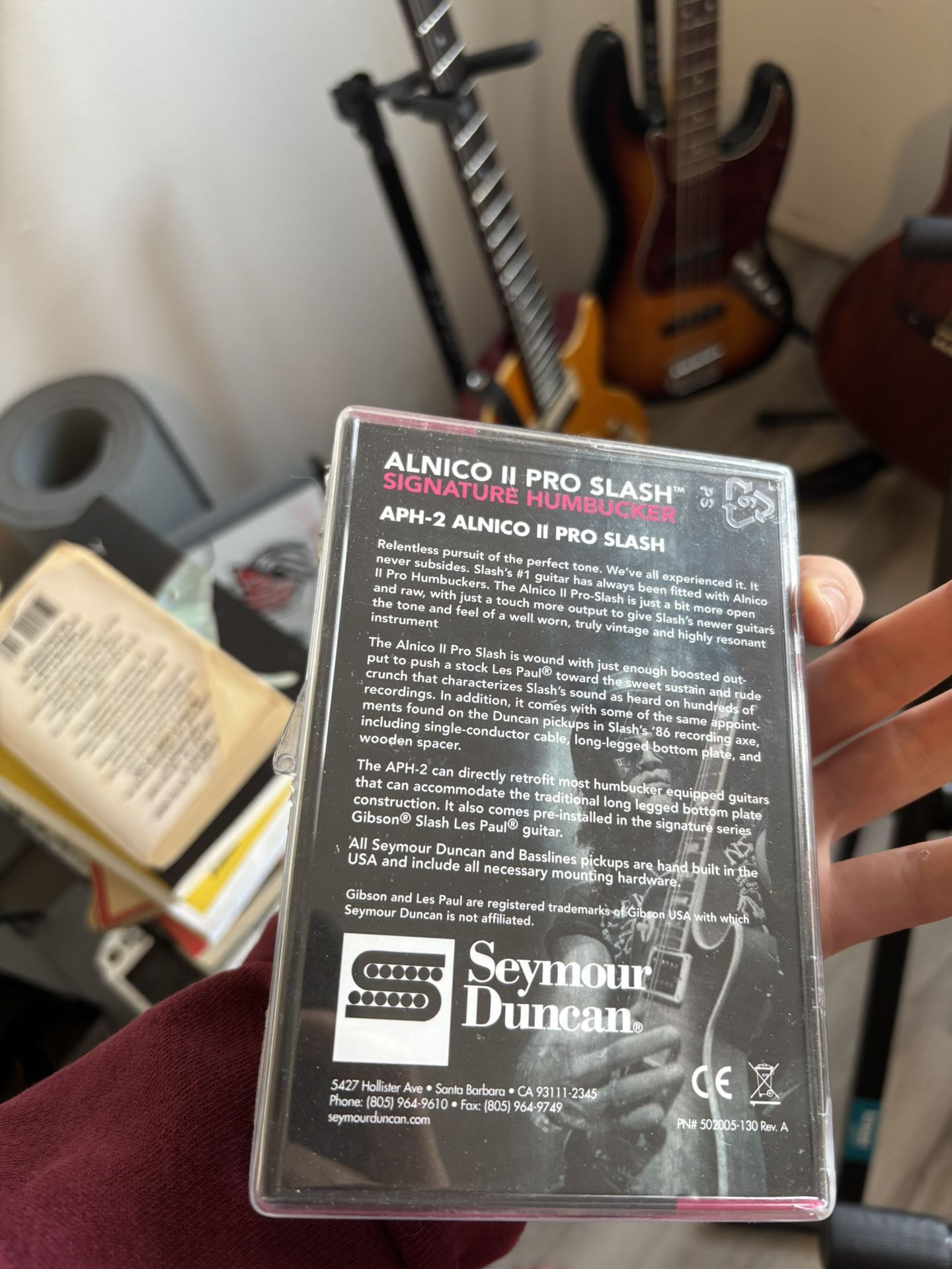 Brand new, never installed Seymour Duncan Alnico II Pro Slash Signature humbuckers. This is the iconic Slash pickup set, known for warm, smooth highs, sweet mids, and that classic rock sustain and bite. Perfect for Les Paul–style guitars or anyone chasing vintage PAF tones with modern clarity.
