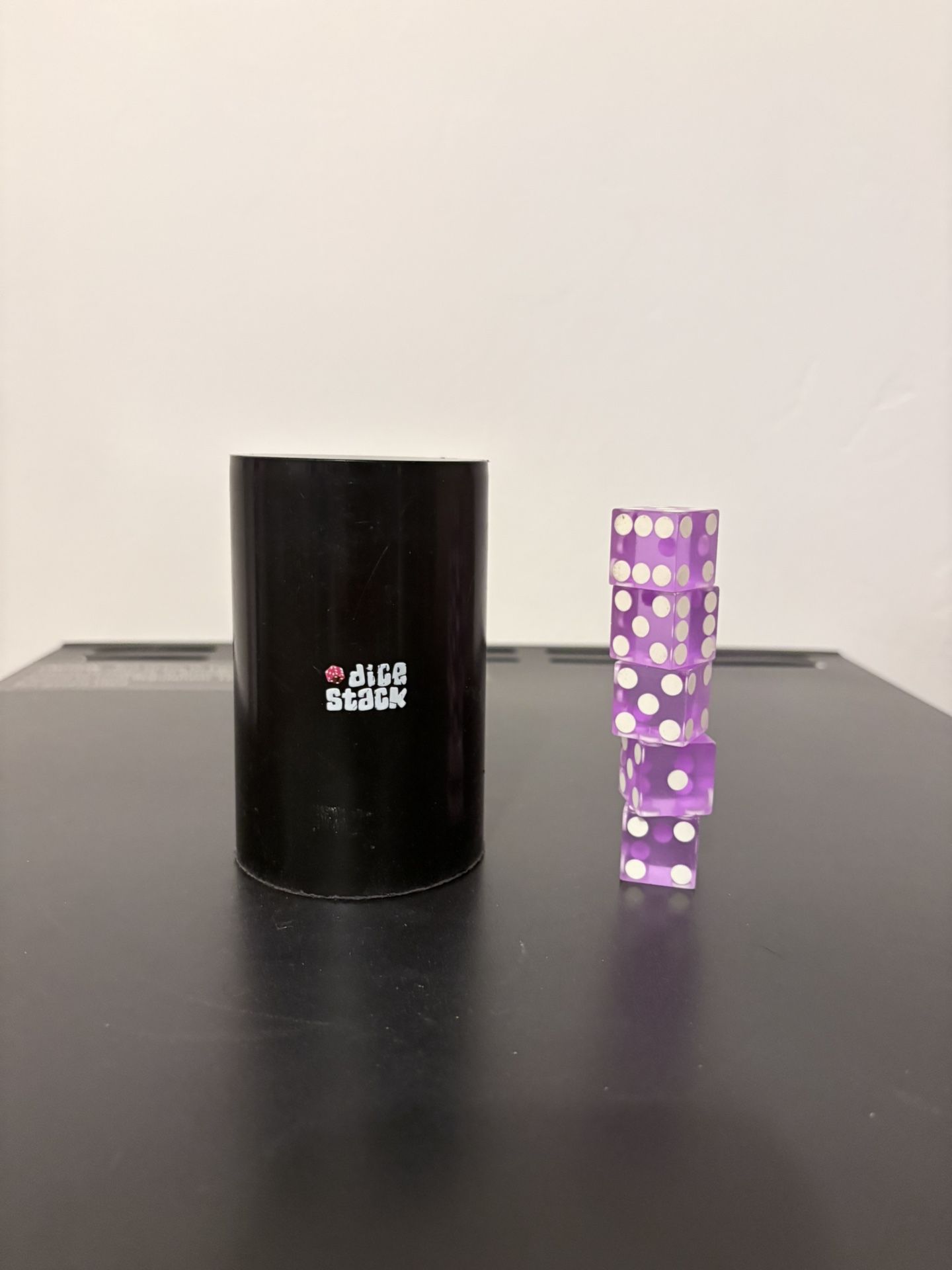 Used Cup with 5 amethyst dice. Comes with a case