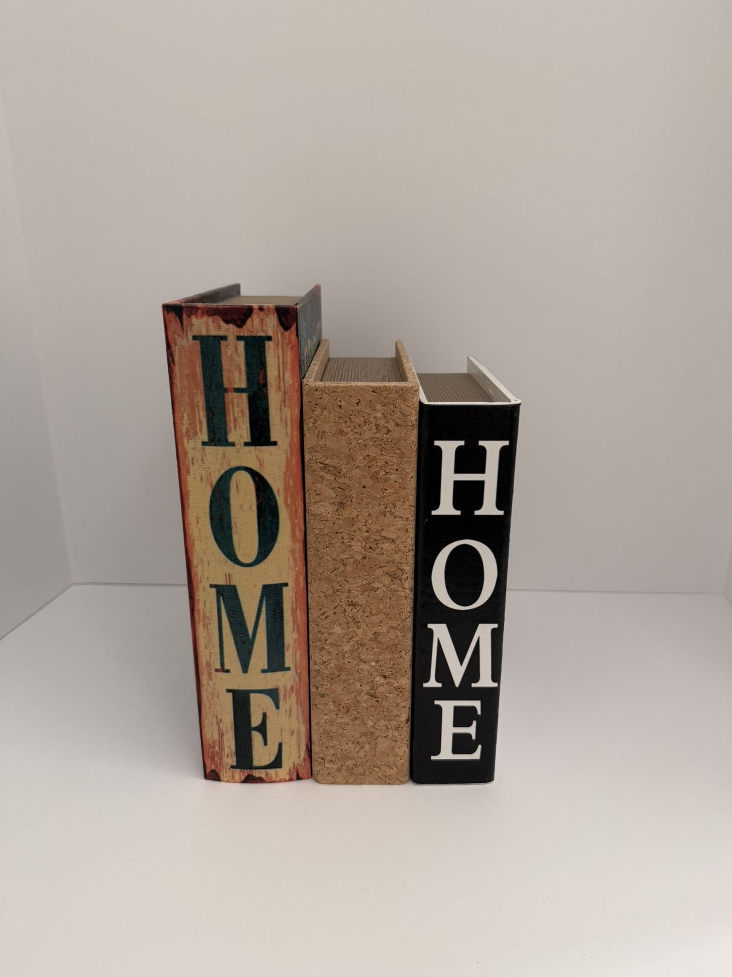 Beautiful set of 3 decorative book boxes with “HOME” designs. These faux books open up to reveal secret storage compartments perfect for keeping small items, remotes, keepsakes, jewelry, office supplies, or personal valuables discreetly hidden.