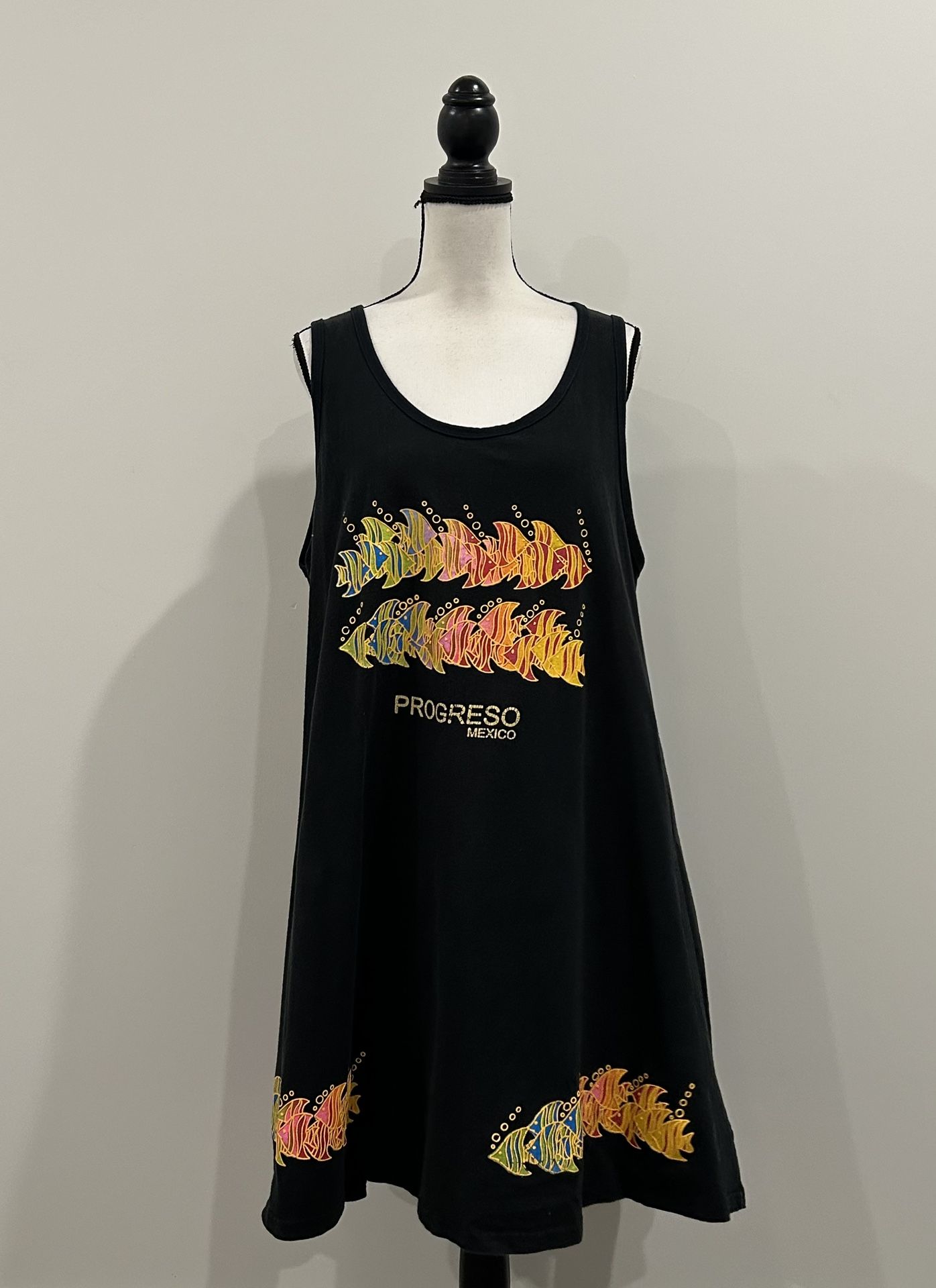 Progreso Mexico swim cover up dress. Black with multicolored fish design. Sleeveless. Slips on overhead. No fabric details or brand information. Some fading and cracking in the letters. One size. Approximate Measurements: Pit to pit - 21.5” Shoulder to hem - 37” 22