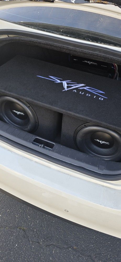 2-12" skar woofers with 1200watt skar amp in a custom skar box . You can hear it before you buy still installed in my car