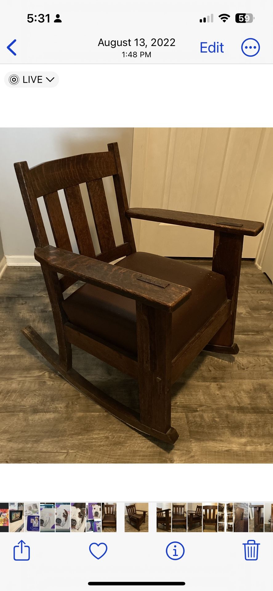 This is definitely a collector item. There’s a matching one in Heritage Village Museum. It does need a new cover on the seat. I replaced the seat cover years ago with faux leather. It does have a few defects…(a small piece of veneer is missing) but For its age it’s in pretty great shape. I’ve personally owned this rocker for over 40 years. It will not look new as it’s approximately 80 years old. Googled Antique Mission Rockers and they start around $500 and up. Need space, must purge. Only serious inquiries please. Porch pick up only. Cash only