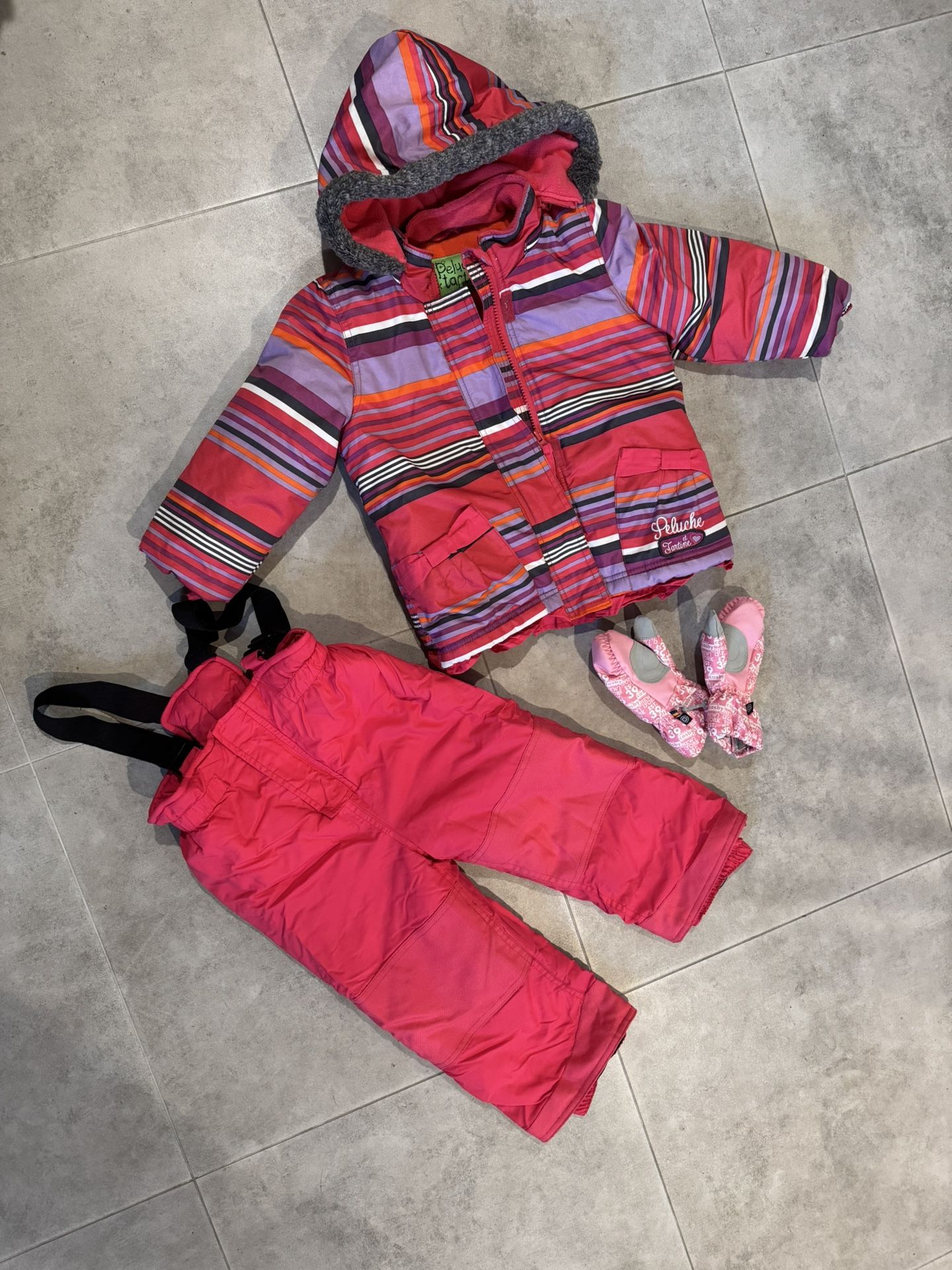 Complete winter ski outfit from Peluche et Tartine, including jacket and matching pants. Suitable for ages 3–5 years. • Condition: 99% new, worn only once, no stains, no damage • Warm & comfortable: thick padding with soft fleece lining • Windproof & cold-resistant, perfect for skiing, snow play, and winter outdoor activities