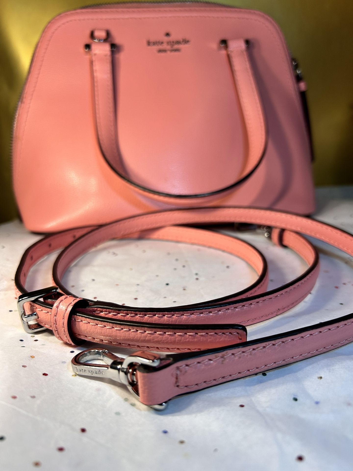 This beautiful Kate Spade New York Patterson Drive Dome Satchel Purse is perfect for any casual occasion. The purse features a zip closure, crossbody strap, and a detachable strap for added convenience. It also has bottom studs for added protection and an audio pocket to keep your music or podcasts close by. The interior is lined with soft fabric and has a satin finish. The purse comes in a lovely pink color with strap accents and a zipper closure. This classic style purse is perfect for any woman who wants to look stylish and feel comfortable.