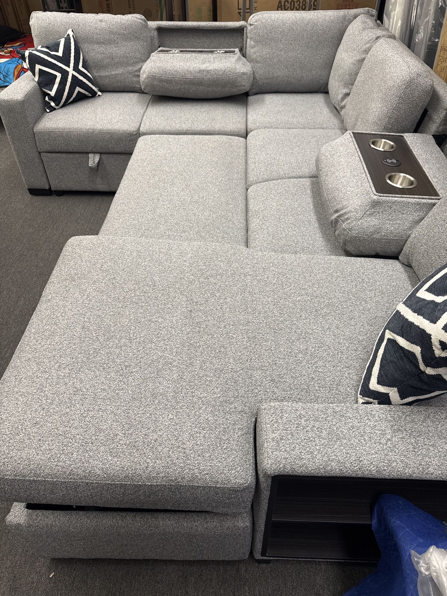 Includes: Sleeper Sofa W/Fold-Down Table, Chaise Storage, Wireless Charging & Built-in Shelf Materials: Boucle Fabric / Solid Wood / Plywood / Spring / Foam / Polyester Fibers / Polyester Fiber Banting / Webbing / Hardware / Mechanism Dimensions: Storage Sofa: 56" x 34" x 37" H; Corner Wedge: 34" x 34" x 37" H; Armless Sofa: 50" x 34" / 60" x 37" H; RAF Chaise: 35" x 60" x 37" H