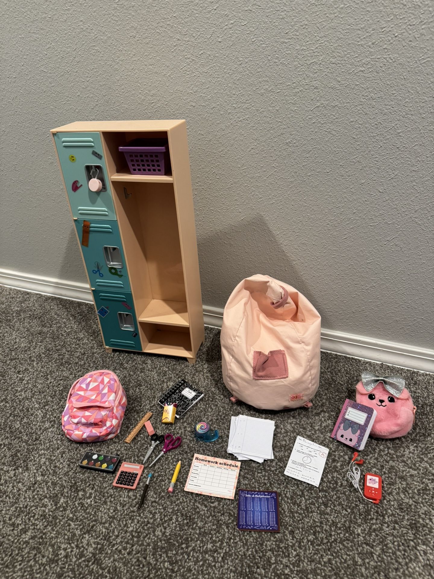 Our Generation Doll locker, school backpack, beanbag chair and extras - in EUC!