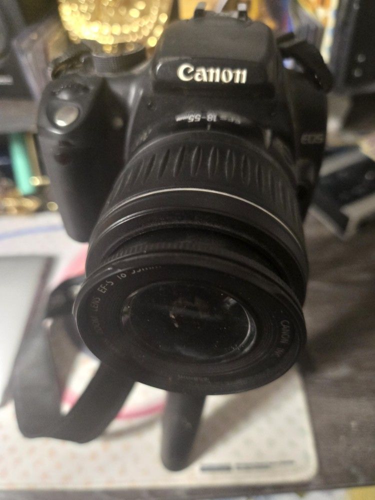 Includes : Canon EF-S 18-55mm F/3.5-5.6 III Camera Lens Camera stand: Helps keep motion still or centered to capture moments in a clean and crisp photo shoot or video Very ideal and great for any time of day Camera strap for support , carry on shoulder Has a working battery. No charger Doesn't include: battery charger memory sd card Or case