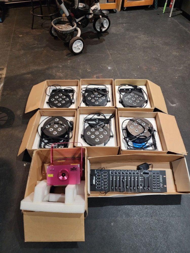 Juego de 6 luces de iluminación ,una luz láser Scorpion con diferentes func ,mezcladora de colores más cables para hacer en serie con poco uso todas funcionan a la perfección