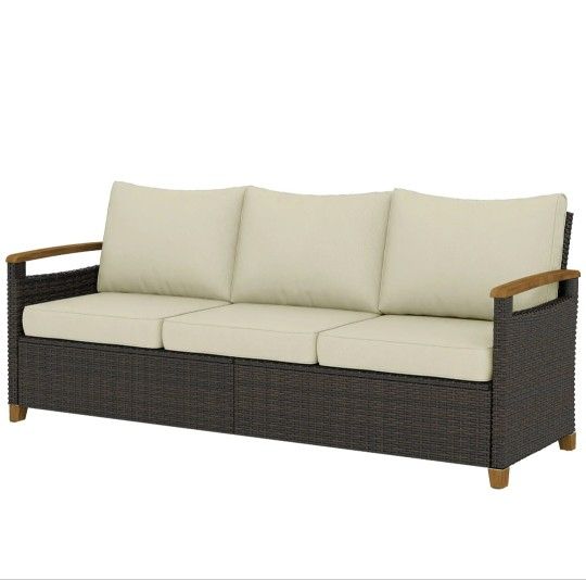 3 Seater Outdoor Couch Sofa, PE Wicker Patio Sofa, Wide Deep Seat, 4" Cushions, Wood-Effect Armrests Legs, Color: Beige $280