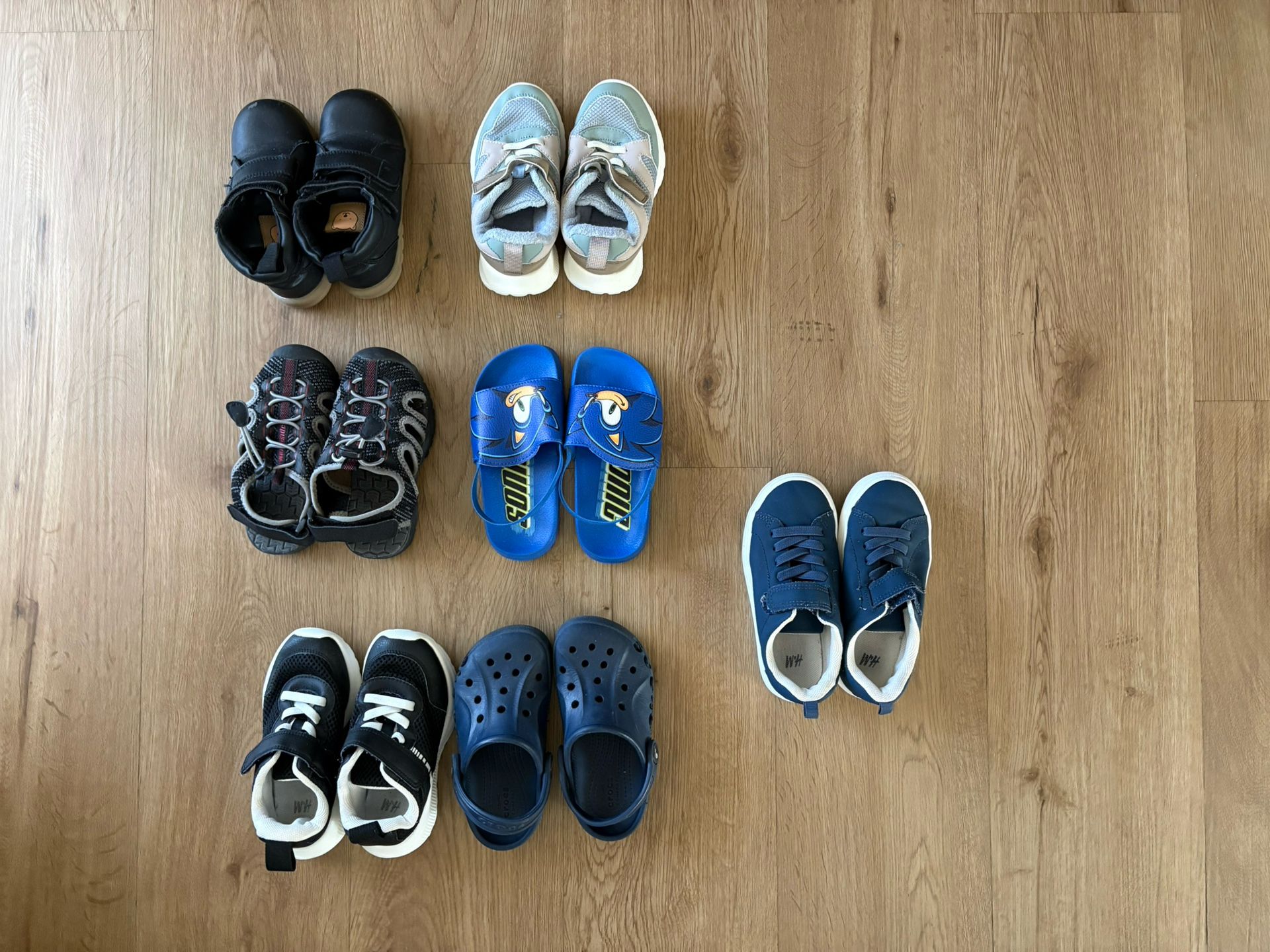 Toddler boy shoes of various sizes. Gently used. Top row boots and sneakers are size 8.5. One boot has a little scrape on the toe. Second row sandals are size 9. Bright blue sandals are NEW and unused. Third row sneakers and crocs are size 9. Blue sneakers on side are size 10. Most shoes are by H&M except for navy crocs and black sandals that I got from Amazon.
