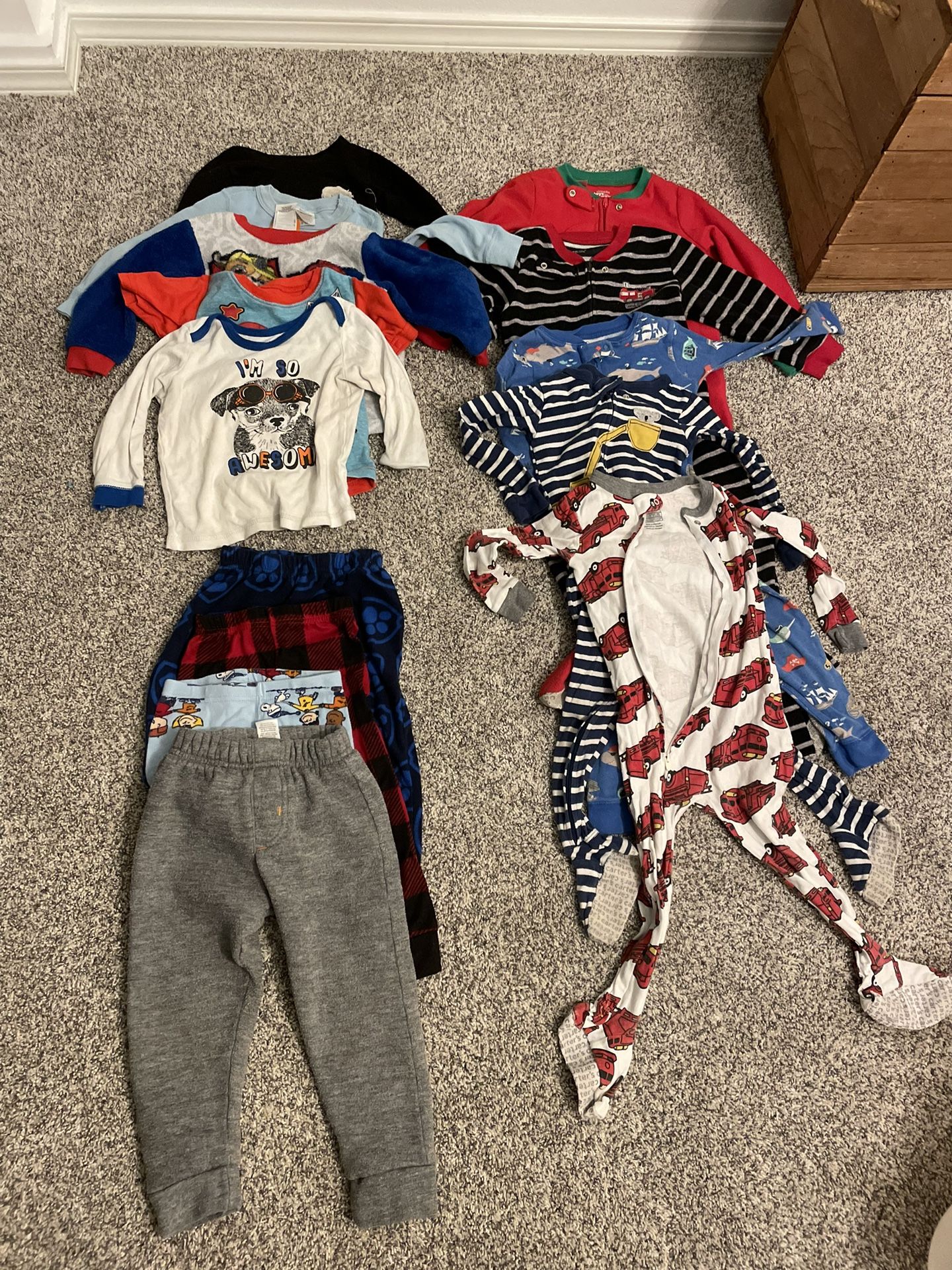 5 long sleeve onsies with zippers 4 long pants 5 long sleeve shirts Non smoking and no pets home Clean, no stains or rips
