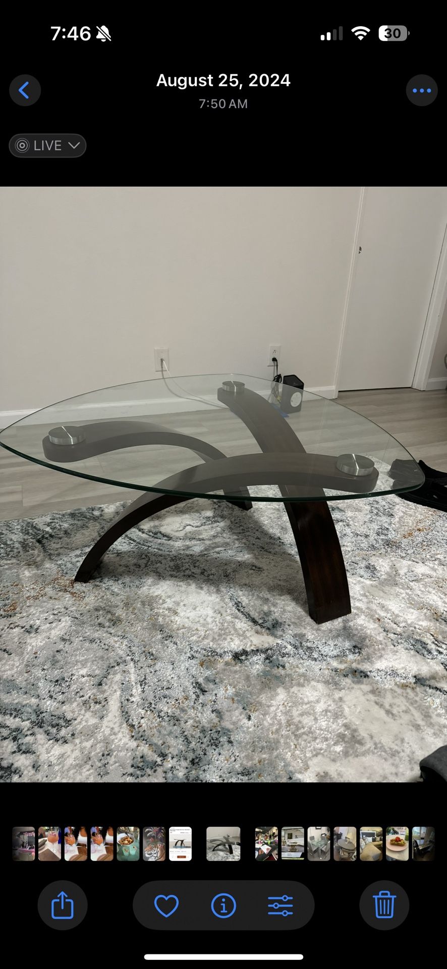 Moving sale, used, cute abstract coffee table. From Living Spaces: Allure Brown Triangle Glass Top + Wood Base Coffee Table