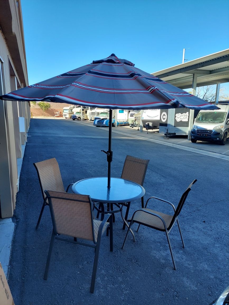 Table, chairs and umbrella for sale. Base not included. This is a great set, it was hardly used and has been storage.
