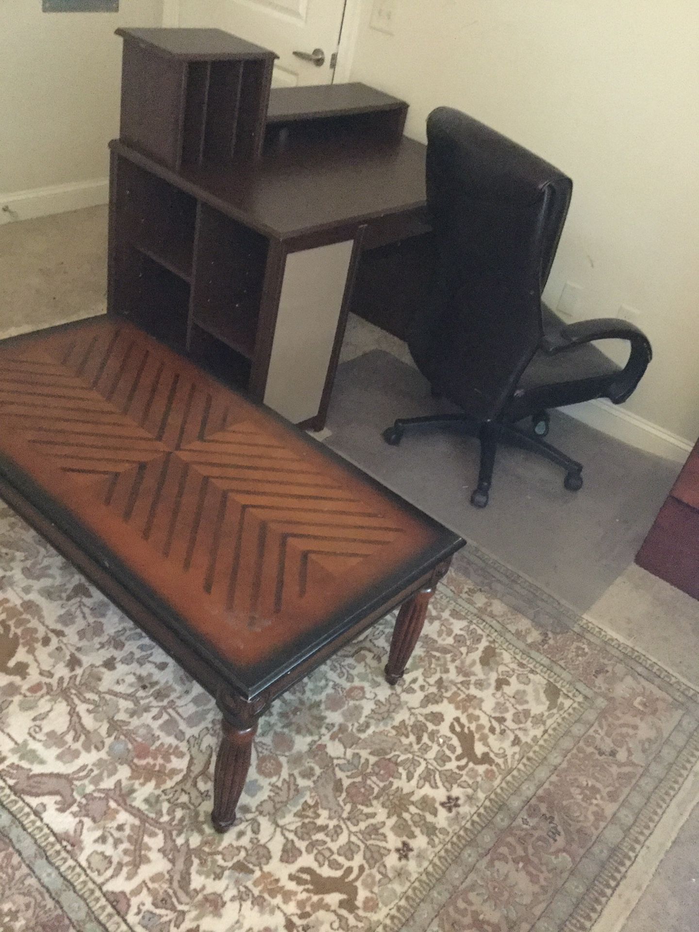 Lightly used office desk, chair, coffee table and rug
