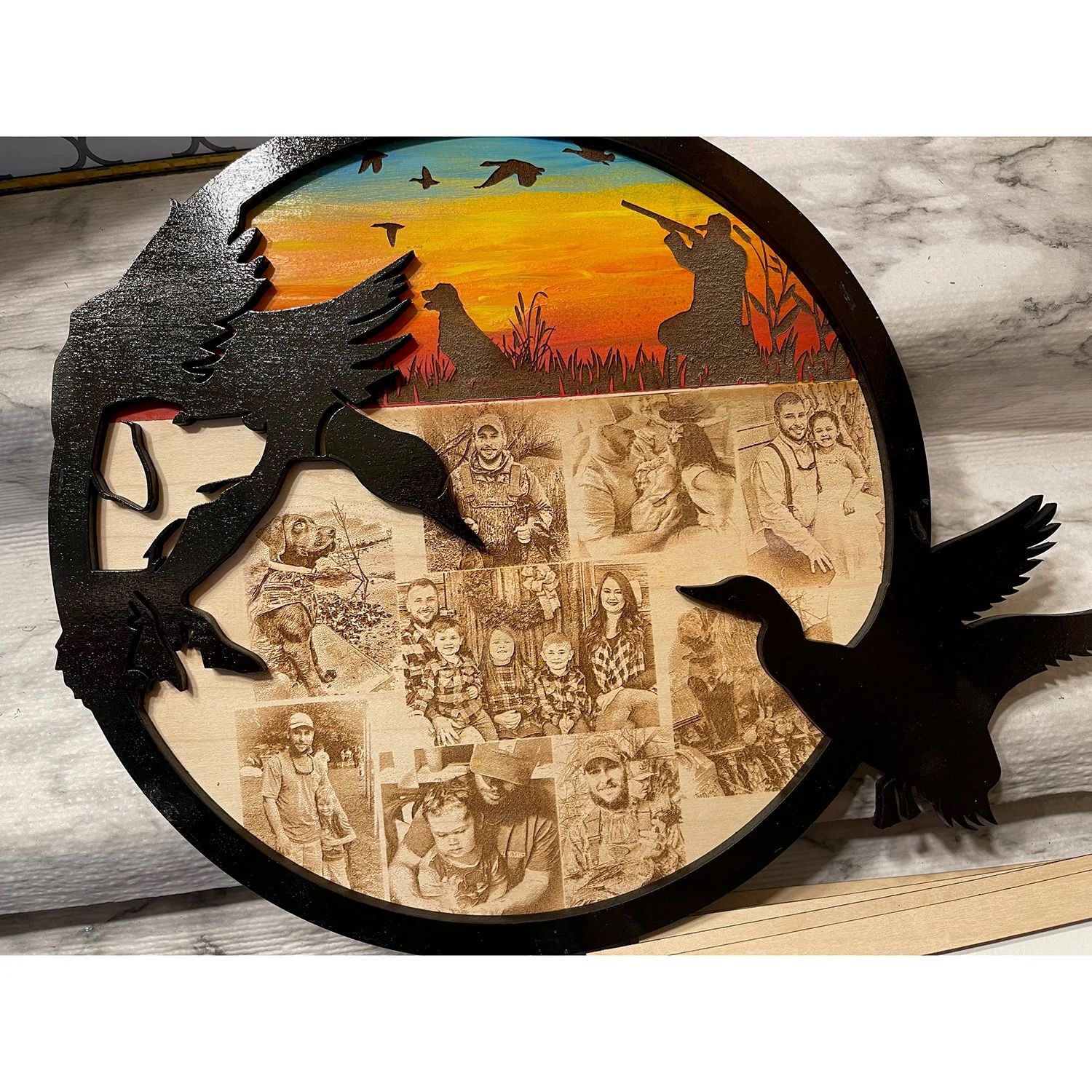 This duck hunting-themed sign is perfect for avid duck hunters. It features a scenic, engraved duck hunting design on the top of the back layer, leaving the entire bottom blank for adding your own photos to engrave. Additionally, it includes a top layer with a duck-hunting theme that can be adjusted to accommodate however many photos you wish to engrave. Check out my profile I can make many different types of products! Stainless steel double walled tumblers, ornaments, signs, tumbler Stanley tags! All priced individually!! Please message me for prices!