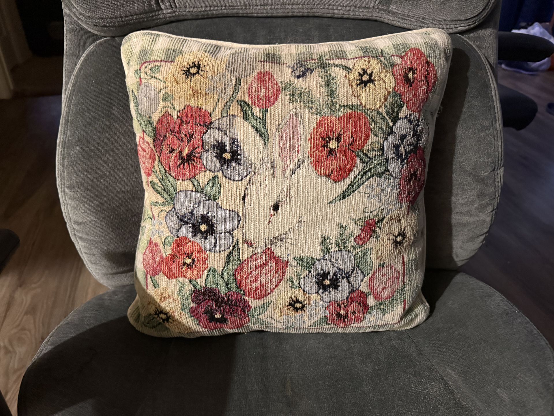 This charming accent pillow is perfect for cottage-core and/or farmhouse decor lovers. It is woven on one side while the other side is a soft, velvety cream colored quilt design. The pillow showcases a woven white rabbit surrounded by a garden of colorful pansies and tulips. This is not a pillow cover with an insert. There is no zipper. This pillow was hand stitched and of very high-quality. My grandmother believes this to be a Manual Woodworkers & Weavers Jacquard Tapestry Throw Pillow. However, since I’m not 100% sure I did not put that in the title. It measures approximately 15”x 15”.