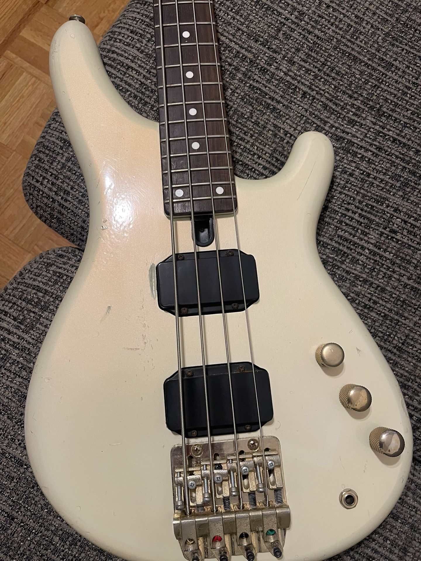 Yamaha Motion Bass from 1980’s for sale, The bass has some dings and scratches but still in good working condition . I’m first owner of the bass. Bass comes with Fender guitar gig bag. Yamaha Motion is passive bass with V/V/T controls, 32” scale, it has humbucker pickups with push/pull switcher for the single mode. Everything works as should. The neck is straight, no technical issues. On the picture you can see some crack on the back side of headstock, it’s stable, nothing changed over 40 years! Weight is under 8 pounds. Here is demo of the bass: https://offerup.co/faYXKzQFnY?$deeplink_path=/redirect/