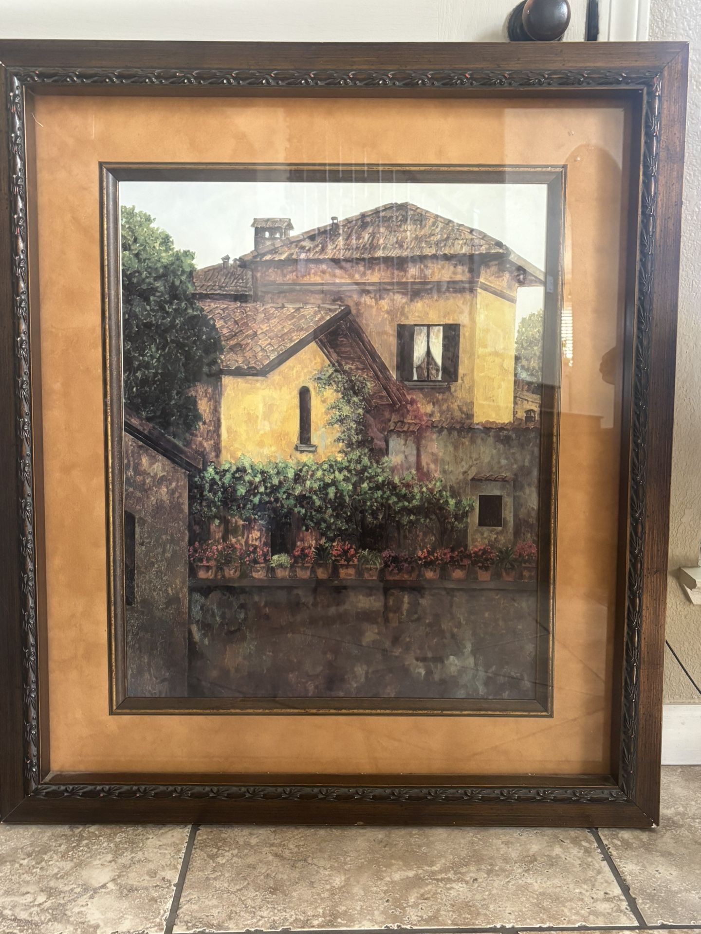 ***OPEN TO OFFERS*** Came from a high end decorator store. New was about $400.00 Beautiful framed Mediterranean villa print Heavy wood frame 30.25”width x 35” height Frame is 2.25 “ thick Very good quality framed art See pic.. one of the wire ends to hang needs to be redone. Picture is pretty heavy- typical of that size wood frame Montserrat Masdeu print